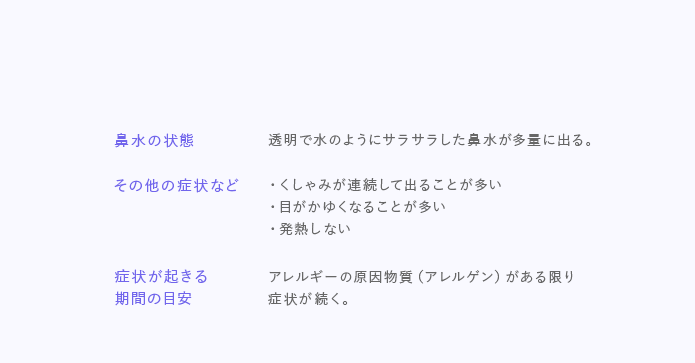 鼻水の原因がアレルギー性鼻炎の場合、鼻水の症状の他に、以下のような症状や経過も目安になります。