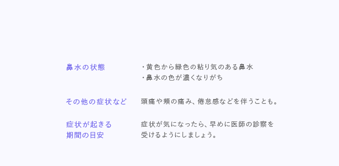 鼻水の原因が副鼻腔炎の場合、鼻水の症状の他に、以下のような症状や経過も目安になります。