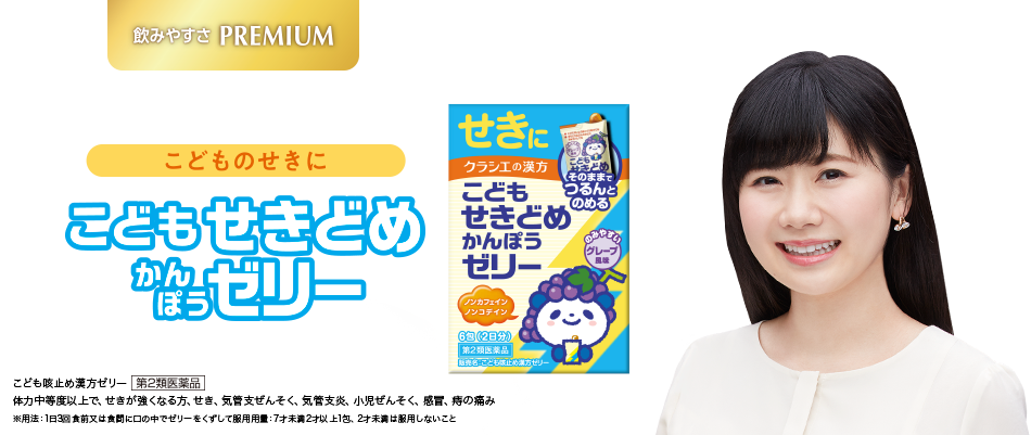 せき、気管支ぜんそく、気管支炎、小児ぜんそく、感冒、痔の痛み※用法:1 日3 回食前又は食間に口の中でゼリ一をくずして服用