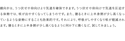 横向きに寝ると、うつ伏せ寝や仰向け寝より気道を確保できるため、夜間の咳を和らげることができます。また横向きや上半身側を少し高くすると呼吸がしやすいだけでなく、鼻水や痰(たん)がのどに流れにくくなり咳が軽減されます。
