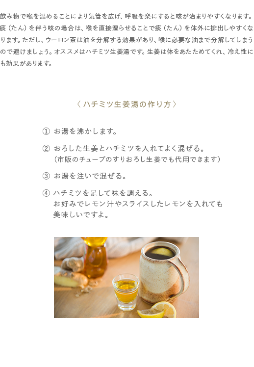 はちみつに含まれている成分には、殺菌作用や荒れた粘膜を保護して炎症を抑える作用などがあり、のどを潤して口やのどの乾燥を防ぐため、はちみつを入れた温かい飲み物がおすすめです。ここでは、体を温める生姜を合わせた「はちみつ生姜湯」の作り方を紹介します。