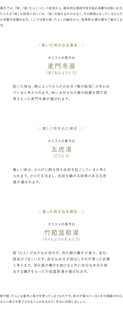 乾いた咳は、熱によってからだの水分(喉の粘液)が失われていると考えられます。体に水分を与え喉の粘膜を潤す効果をもった麦門冬湯が選ばれます。