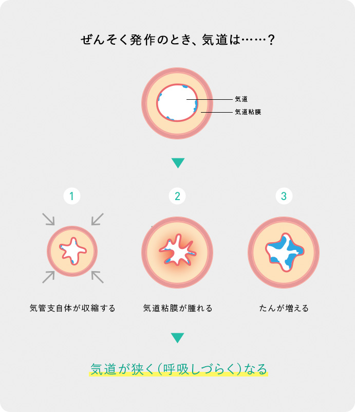 アレルギー物質などの影響で、これらが複合的に起きることで、気管支ぜんそくになると考えられています。
