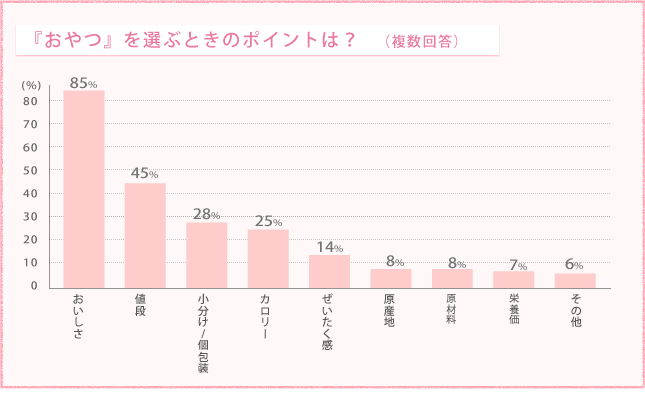 『おやつ』を選ぶときのポイントでは、断トツで『おいしさ』がトップに★おいしくなければ毎日のようには食べないですよね。