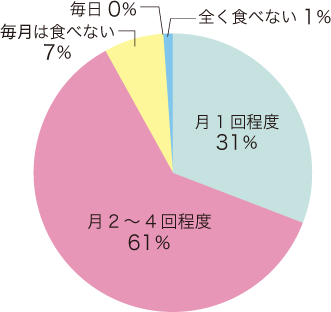 そこで、たんぽぽメンバーのみなさんにカレーの好き嫌いについて調査したところ、9割の方が「好き」と回答。月に何回ぐらいのペースでカレーを食べるかについては、「月1回程度」が31%、「月2~4回程度」が61%、「毎月は食べない」が7%、「毎日」が0%、「全く食べない」が1%という結果に。5人に3人が、月2~4回程度カレーを食べているということがわかりました。
