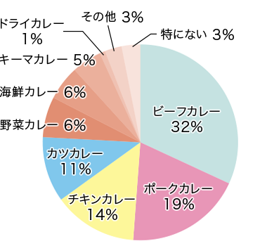 一番好きなカレーでは「ビーフカレー」が1位でしたが、ご家庭で作るカレーのお肉には、手頃な価格で購入できることもあってか「豚肉」が一番使われていました。