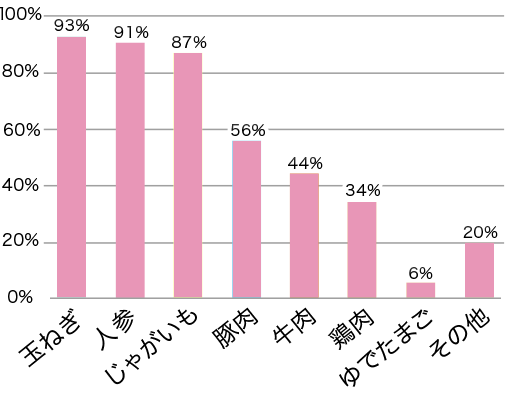 そこで気になるのが、カレーの中身。ご家庭で作るカレーの中にはどのような具材を入れるのか聞いてみたところ、1位玉ねぎ(93%)、2位人参(91%)、3位じゃがいも(87%)、4位豚肉(56%)、5位牛肉(44%)、6位鶏肉(34%)、7位ゆでたまご(6%)、その他(20%)と続きました。カレーの具材として入れる野菜類に関しては、玉ねぎ、人参、じゃがいもは不動の食材のようでした。