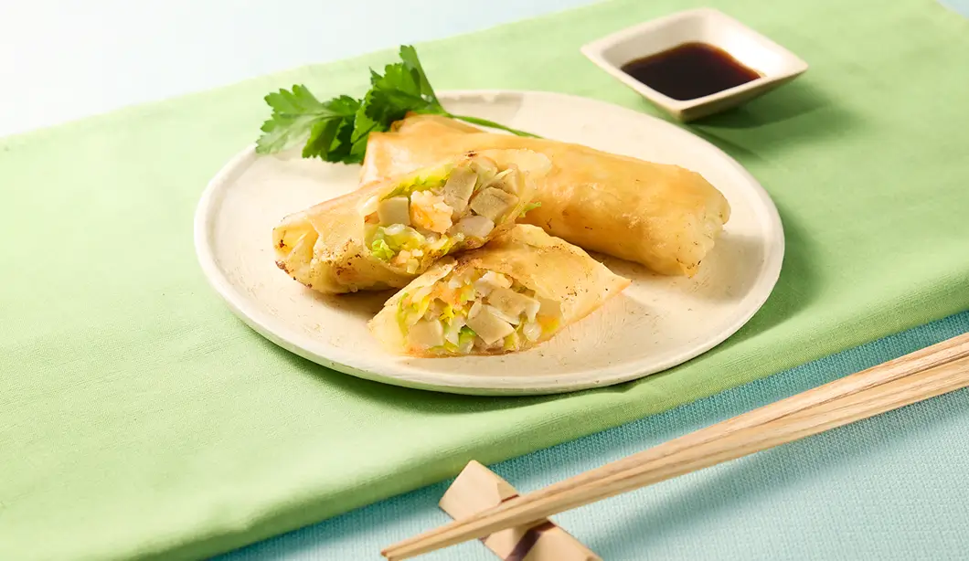 皮で巻く①の水気を絞り4等分し、春巻きの皮で巻く。