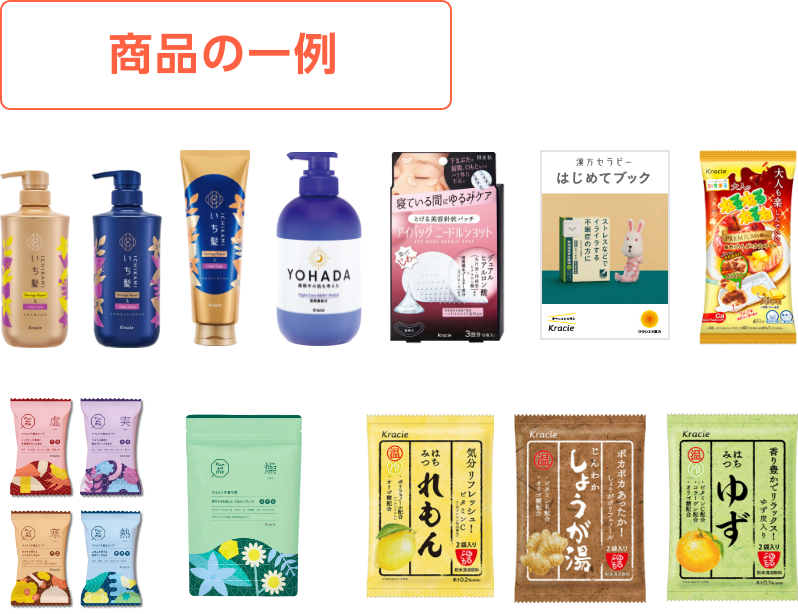 シャンプー、スキンケア商品、お菓子やほっと飲料など、