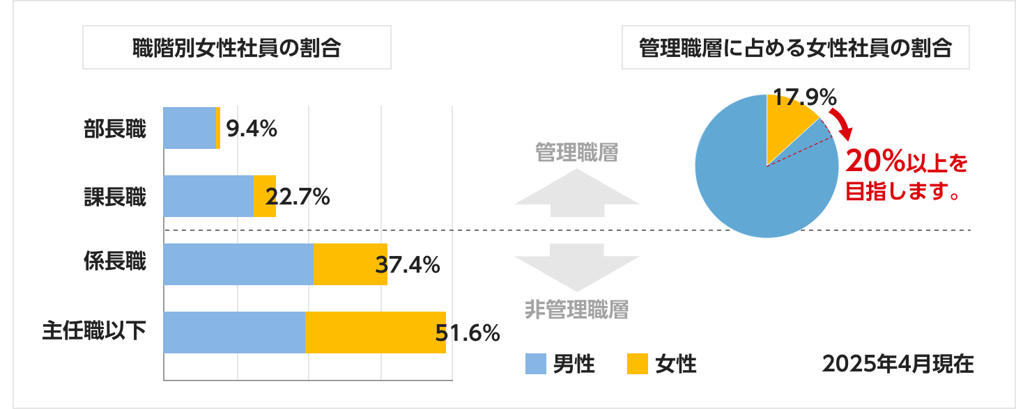 2025年現在、グループ全体の管理職(含、管理職と同等の専門職)に占める女性割合は17.9%であり、クラシエはこの割合の更なる向上を目指します。