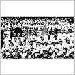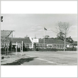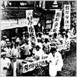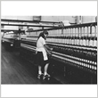 ローラースケートを履いて精紡機の糸つぎをする女子社員 -
