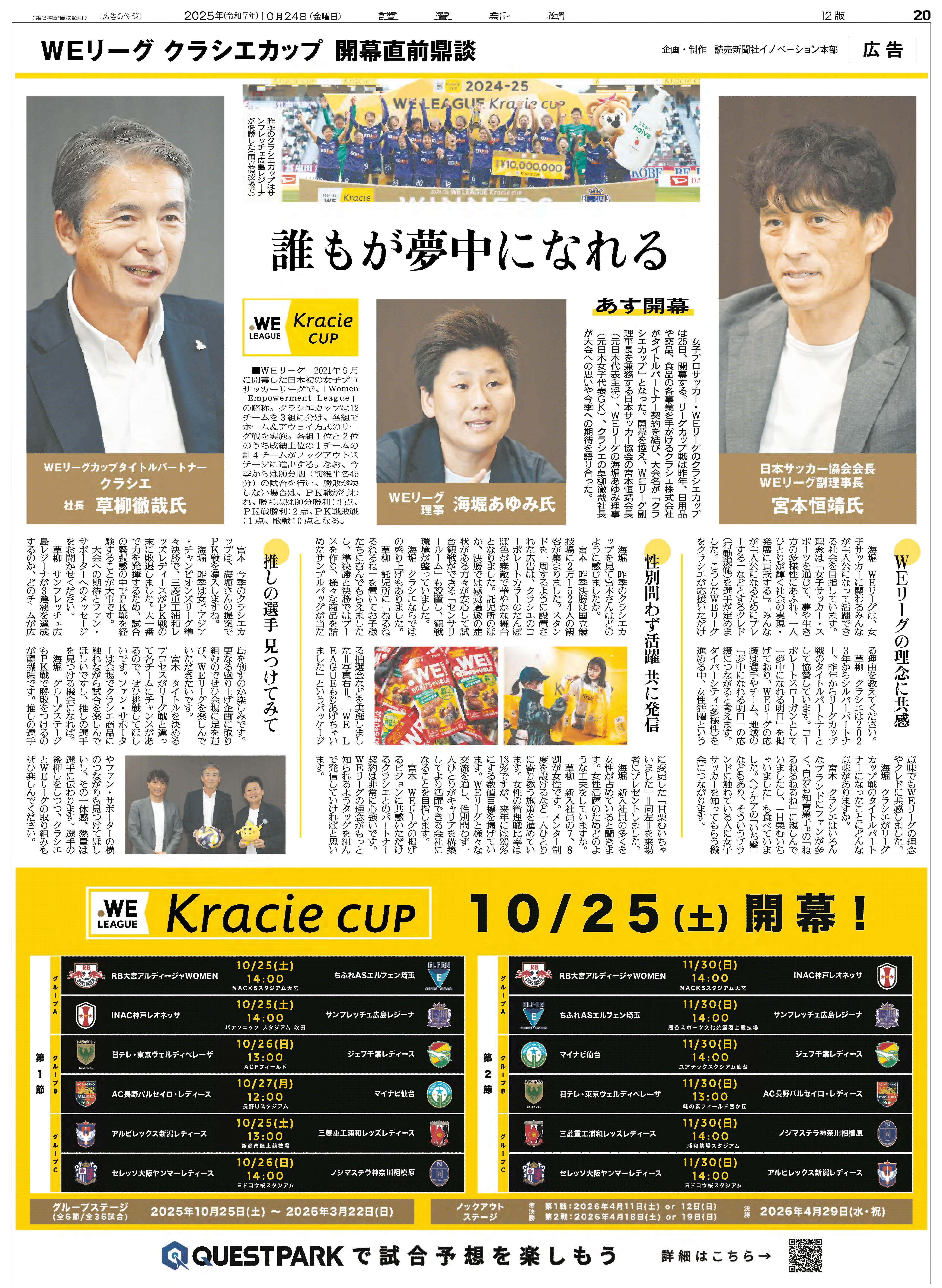 クラシエは、WEリーグの理念「女子サッカー・スポーツを通じて、夢や生き方の多様性にあふれ、一人ひとりが輝く社会の実現・発展に貢献する。」に共感し、2023年からシルバーパートナー、加えて2024年からはリーグカップ戦のタイトルパートナーとしてWEリーグへの協賛を行っています。