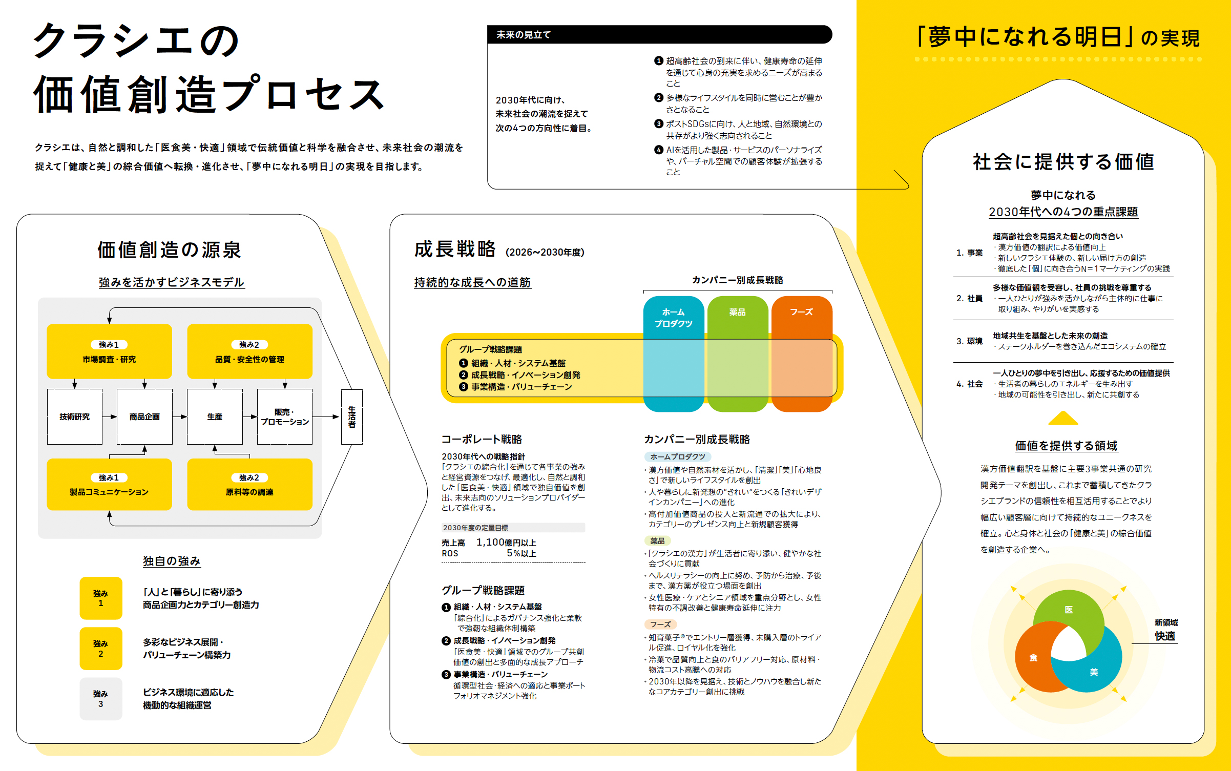クラシエは、自然と調和した「医食美・快適」領域で伝統価値と科学を融合させ、未来社会の潮流を捉えて「健康と美」の綜合価値へ転換・進化させ、「夢中になれる明日」の実現を目指します。