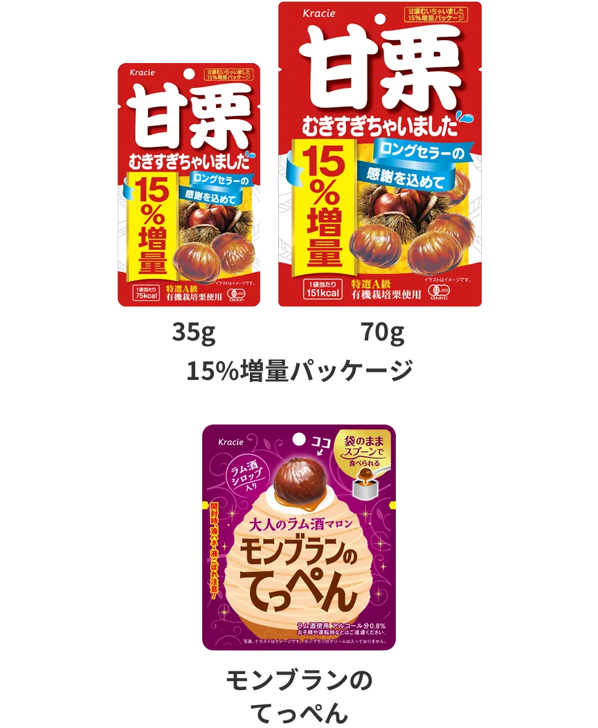 当時は栗といえば「天津甘栗」として皮付きの栗が主流であり、栗は皮をむく必要があるため、「おいしいけど面倒」という位置づけで、“気軽に食べられるお菓子”という認識はありませんでした。これを外出先でも手軽に食べられる「ポケット菓子」にしたらおもしろいのでは?という新たなコンセプトのもと、栗の皮をむく製造工程から、むいた栗をおいしく提供するための包装形態の開発に着手し、当時では珍しい固形物のレトルト商品「甘栗むいちゃいました」が誕生しました。(当時はレトルトといえば、カレーのような液状のものが一般的でした。)
