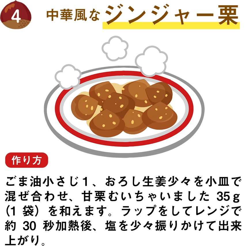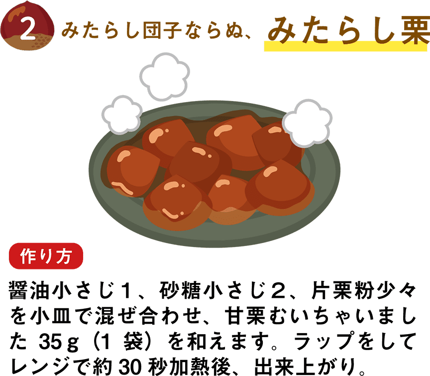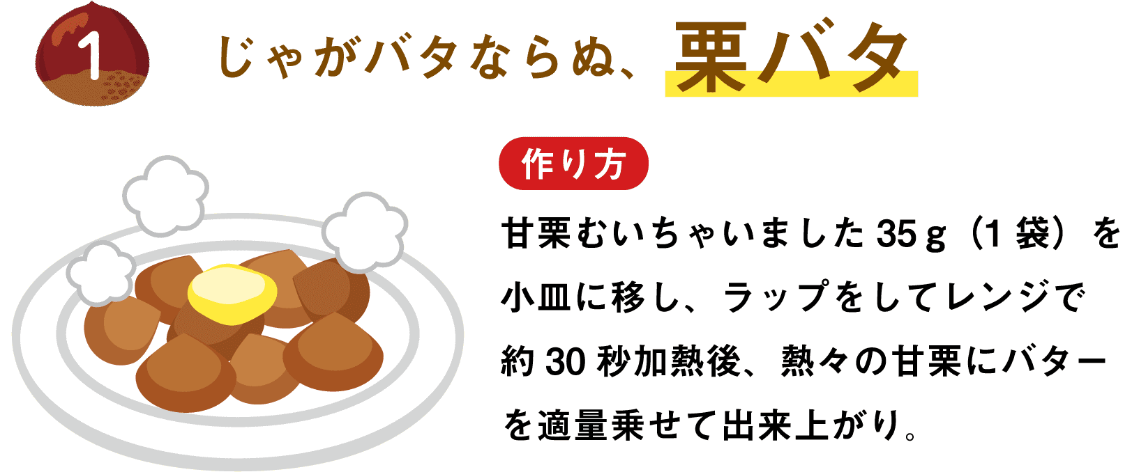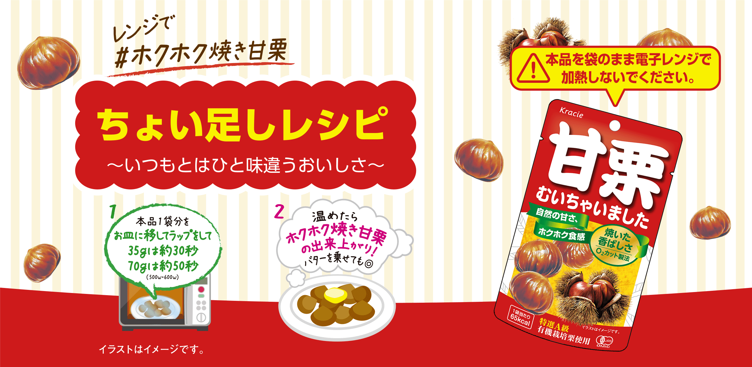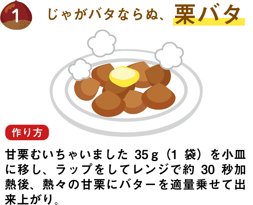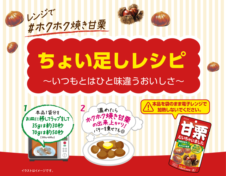 分量や加熱時間は、甘栗むいちゃいました35g(1袋)を想定しています。甘栗むいちゃいました70g(1袋)の場合は、2倍量を目安とし、レンジでの温め時間は約50秒です。