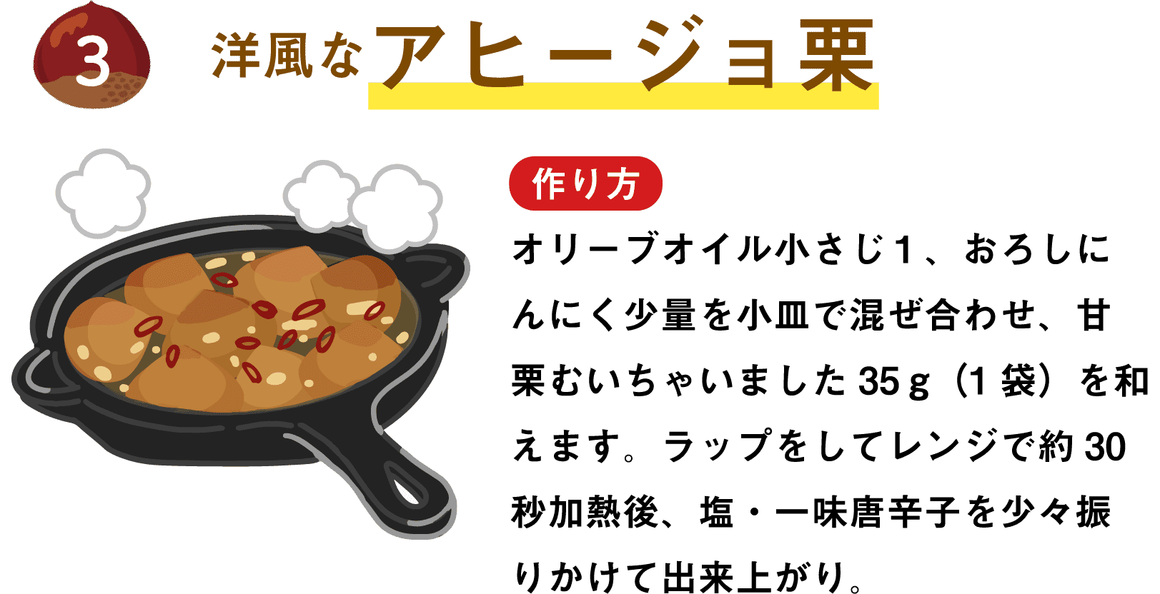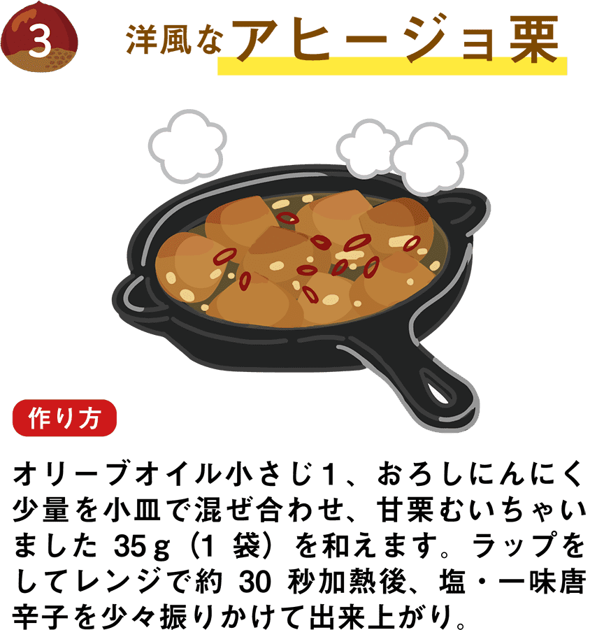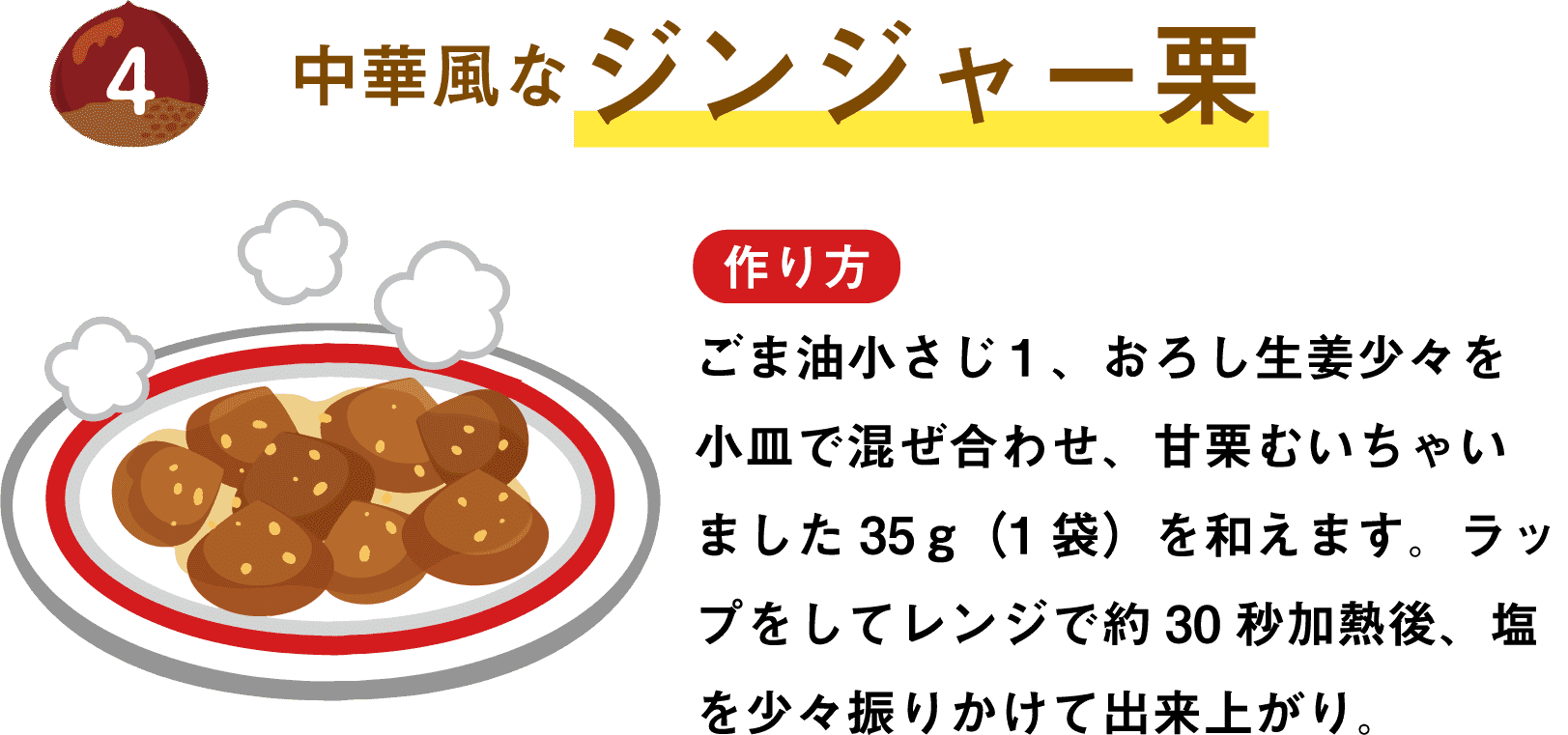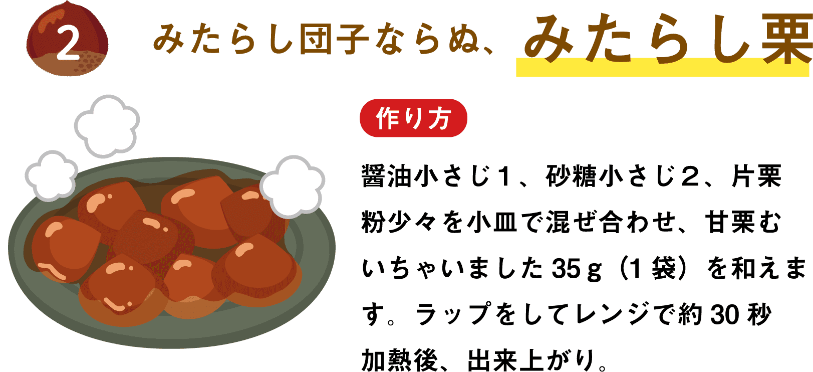分量や加熱時間は、甘栗むいちゃいました35g(1袋)を想定しています。甘栗むいちゃいました70g(1袋)の場合は、2倍量を目安とし、レンジでの温め時間は約50秒です。