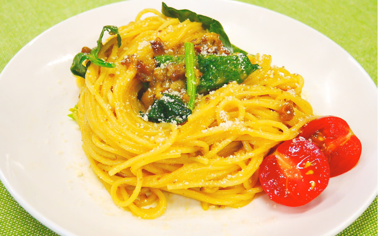 - ➍全体に煮立ったら、ゆでたパスタを加え混ぜ合わせて出来上がり。皿に盛り付け、お好みでパルメザンチーズをふりかけ、トマトを添えてお召し上がりください。