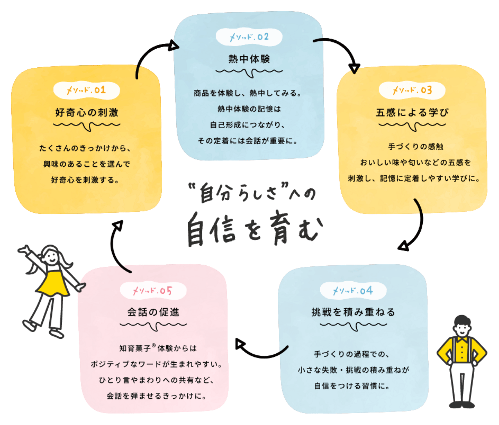 知育菓子®は、楽しさやおいしさだけではなく、好奇心を刺激し、熱中し、五感による学びにつなげられるように開発を行っています。