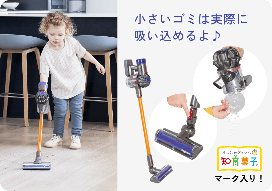 スイッチを押すとモーター音が鳴って、(実際に)軽くて小さい紙くずやポリビーズを吸うことができるよ!ノズルを付け替えたり、ハンディタイプにしたりしてお片付けまで楽しもう♪- ・誤飲窒息の危険がありますので、対象年齢未満のお子さまには絶対に与えないでください。