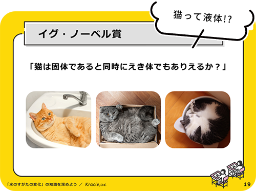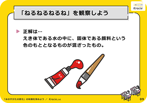 「ねるねるねるね」は、水(液体)に、二酸化炭素(気体)や多糖類(固体)が混ざったものです。その状態を子どもが固体・気体・液体ではない第4の状態であると誤解しないよう、気をつけて指導しました。