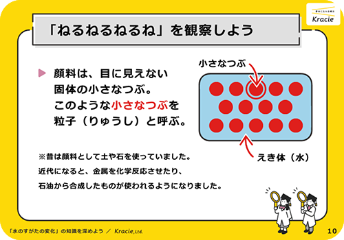 絵の具は「固体?液体?気体?混ざり合ったもの?」という発問をします。回答を聞いた後、絵の具は、液体である水の中に、固体である顔料という色のもととなるものが入っている状態であることを説明。絵の具の中には目に見えない小さなつぶつぶがあり、それを「粒子」と呼ぶことを伝えます。
