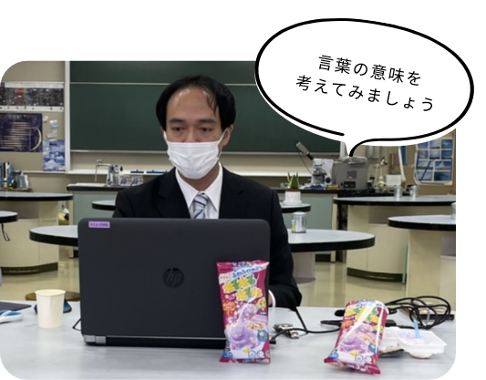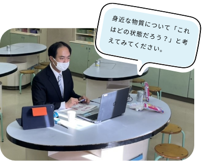 物質の三態(固体・液体・気体)について理解できたか、また、固体、液体、気体が混ざり合った状態の物質があることを理解できたかを振り返ります。身近な物質の状態は何だろう、という視点をもってほしいことを伝えます。