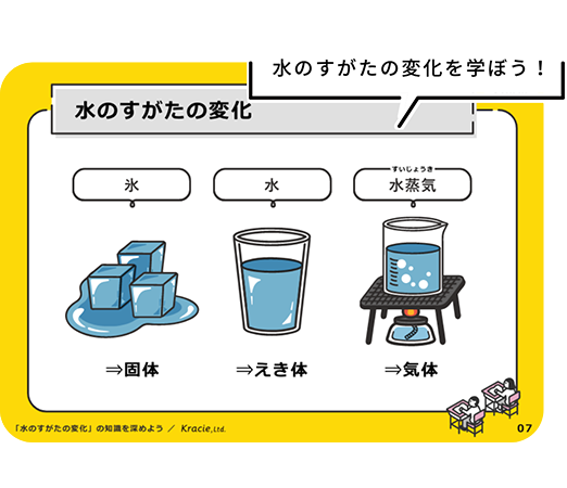 水を冷やしたり温めたりすると、氷になったり水蒸気になったり、状態が変化することを確認。氷の状態を固体、水の状態を液体、水蒸気の状態を気体と呼ぶことを指導します。