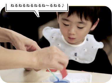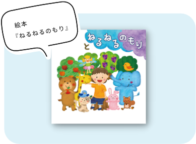絵本『ねるねるのもり』は、ねるねるの森に雨が降らなくなり、困った動物さんたちを、妖精さんが教えてくれた魔法の粉「ねるねるねるね」とお水を使ってぶどうや雲をつくり助ける物語。絵本を読みながら主人公になって、問題解決をしていきます。絵本をただ読むのではなく、「ねるねるねるね」をぶどうや雲に見立てて作ったり、食べたりと、五感を使った活動を通して、ねるねる、ぐるぐるなどオノマトペなどの言葉に触れます。絵と文字、耳に残るオノマトペのフレーズ、そして実際に「ねるねるねるね」を作ってオノマトペを体感することで、言葉の意味理解を深めます。また、エピソード記憶として残り、言葉の定着も期待できます。 「ねるねるねるね」は、粉や水を混ぜることで色が変わったり、膨らんだりする面白さがあります。また、形状が固定的でないため、様々なものに見立てて扱うことができ、かむことが苦手な幼い子が食べやすい点も魅力的です。