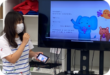 事前に一人ひとりの絵本に、子どもの名前を書き、物語の中で動物さんたちのために問題を解決し、感謝されていると実感できるようにしました。絵本を大型テレビで見たい子は前に集まり、手元の絵本の方が注目しやすい子は座席に座って参加できるようにし、子どもたちの実態に合わせた配慮も。また、「どんなにおい?」「どんな味?」など五感を通して考えられるような声がけも行いました。