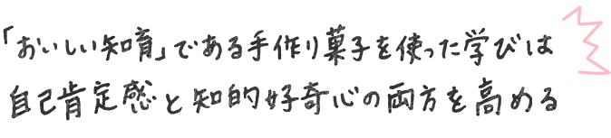 知育要素のある手作り菓子は「食べる」という行為の中に、学力の向上で重要な自己肯定感と知的好奇心の両方を高める要素が含まれ得ると考えています。