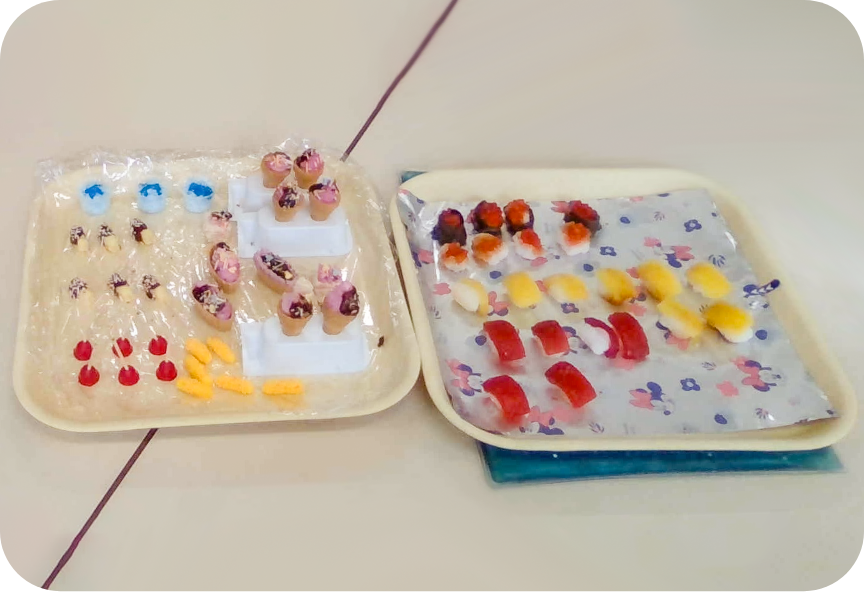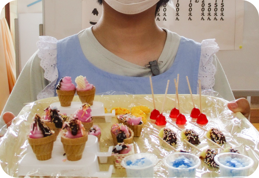 知育菓子®を使って実際にお店で販売する商品を作る活動を行いました。手先が不器用な子どもや手順が理解しにくい子どもでも、知育菓子®が1つずつパッキングされているため、作りやすそうでした。