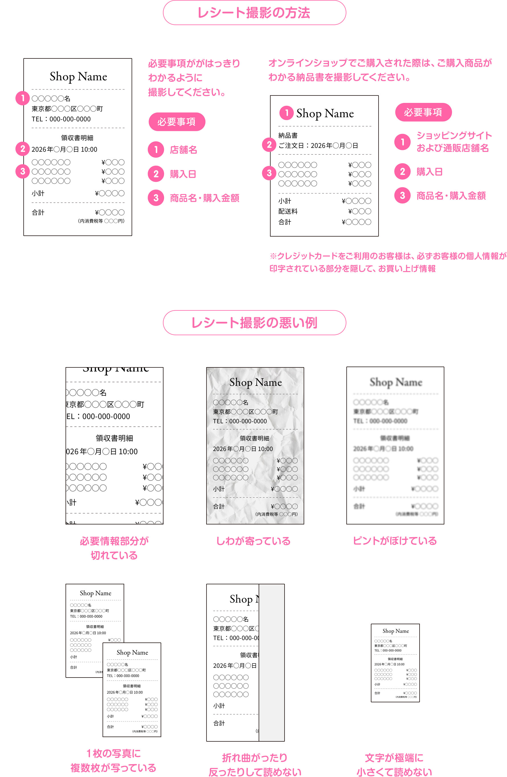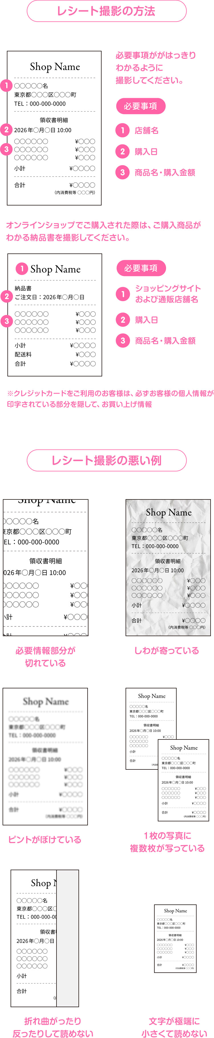 購入した「商品名」「購入金額」「購入日」「購入店舗名」がはっきりわかるように撮影をお願いいたします。