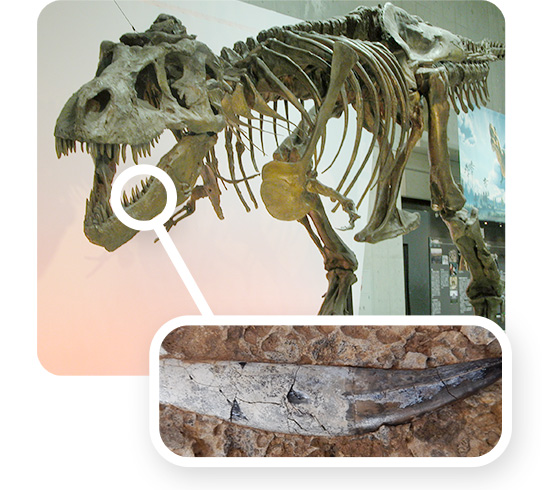 ティラノサウルスは鋭い歯と強いあごを持っているよ。 歯は骨も貫いてしまうくらい鋭く頑丈なんだ。 硬い骨を食べていたら、歯が折れてしまわないか心配だよね。でも大丈夫!