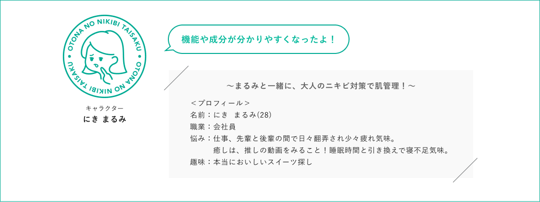 くり返しできてしまう大人のニキビには、皮脂を取り除き、肌を清潔にすることに加え、乾燥などの要因でバリア機能の低下した肌をたっぷりと保湿し、角質の水分バランスを整えることが大切です。