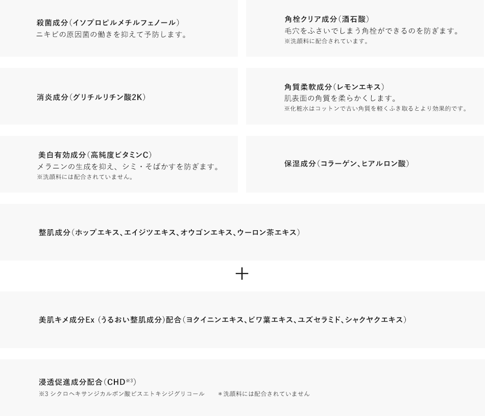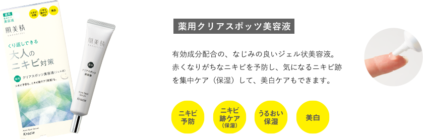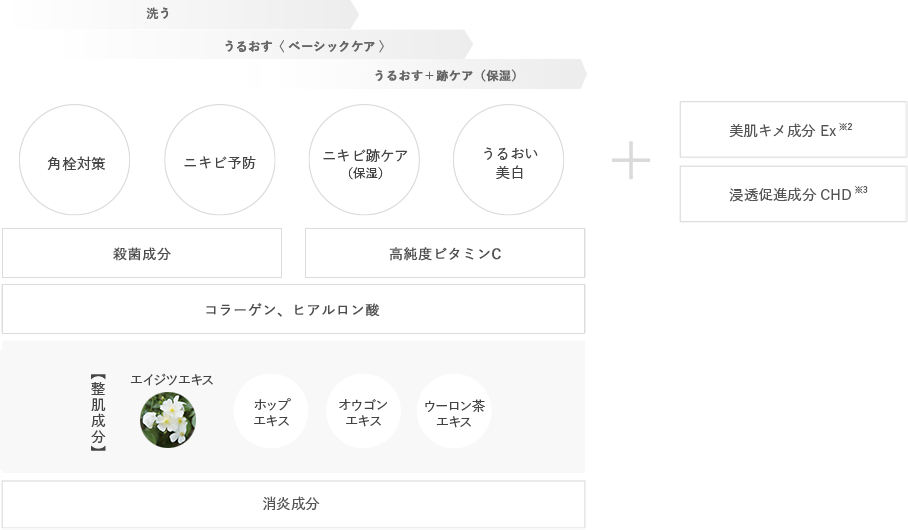 洗顔・化粧水・クリームのお手入れで、ニキビ予防、ニキビ跡ケア(保湿)に加え、うるおいケア&美白ケア※1、角質ケアが同時に可能な薬用シリーズ。