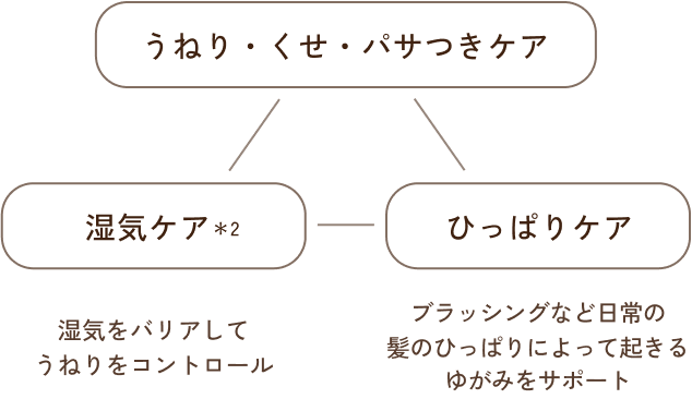 素直な髪へ髪のゆがみが起こりやすいタイミング「年齢」「湿気などの外部環境」「ブラッシングなどによるひっぱり行為」に着目。「髪ゆがみケアテクノロジー」で、髪のゆがみを内部&外側から整えて、素直で扱いやすい髪へ導きます。