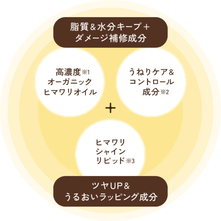 うねりコントロール成分とヒマワリシャインリピッドが髪をWでコート。浸透サポート成分※4で髪の内部に素早く浸透し、傷みのひどい毛先も効果的に補修します。さらに、紫外線カットしながら、光を味方にツヤをアップさせます。