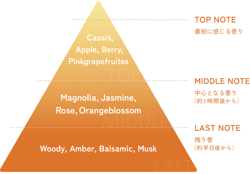 カシスとグレープフルーツを中心とする活き活きとしたトップノートに、ローズ、マグノリアを中心とするフローラルで艶やかさを添え、バルサミックトーンで余韻の深いラストノートに仕上げました。