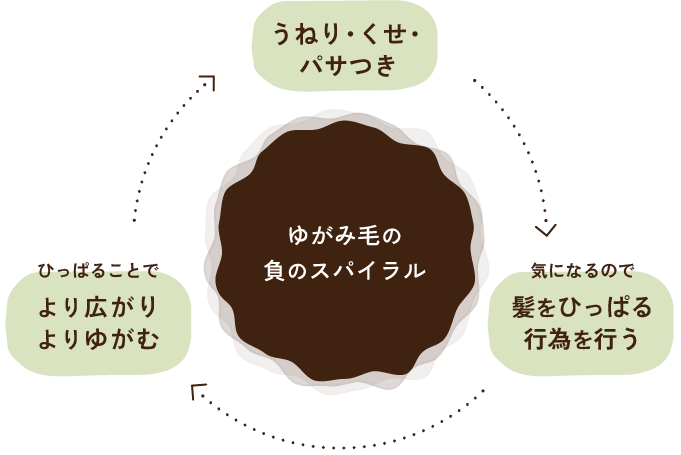 くせやうねりを直そうと髪をひっぱればひっぱるほどくせやうねりが激しくなるという「負のスパイラル」が起きてしまっています。「ひっぱり行為」により髪がゆがんでしまうのは、髪の内部のタンパク質がもろくなるからです。毎日の何気ない「ひっぱり行為」で髪に負担がかかり、ゆがみが蓄積されてしまうので日々のケアが大切です。