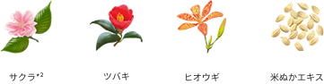 *1 サクラ(サクラ葉エキス)、ツバキ、ヒオウギ、米ぬかエキス