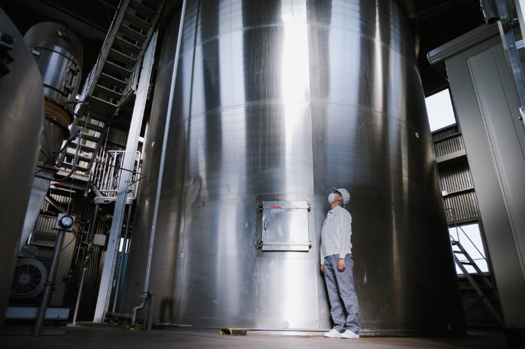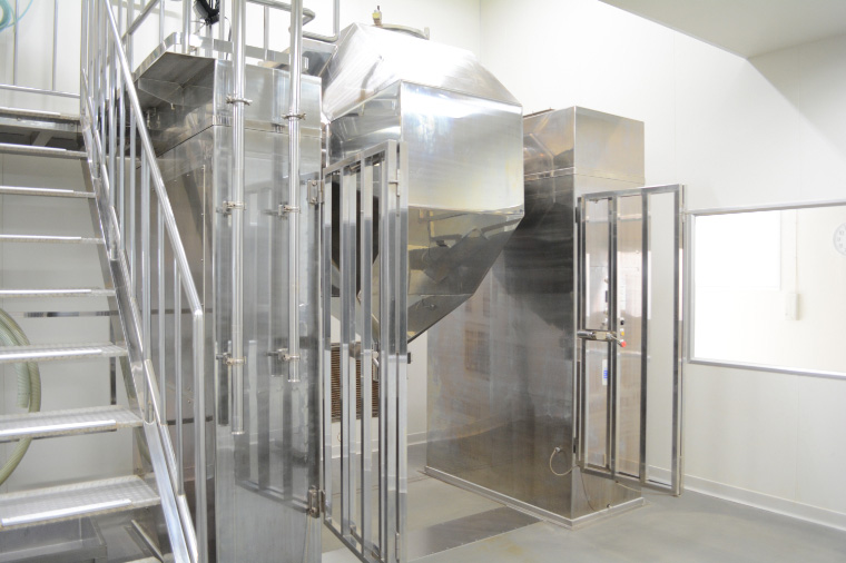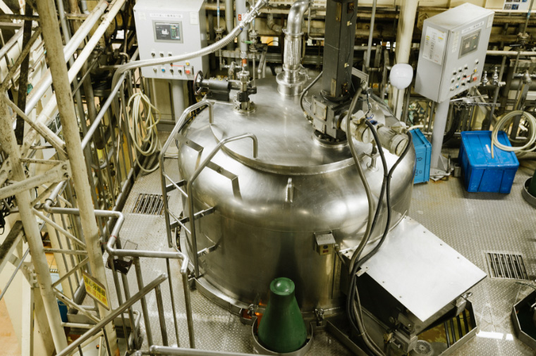 巨大な遠心分離機で一気に固形物と液体を分離。有効成分を取り出した残渣は肥料などに再利用されます。分離された抽出液を濃縮し、ここでしっかり殺菌。自然由来の原料だから微生物や細菌がいるのは当然なのですが、さまざまな形で手を加えることで医薬品基準の品質へと導いていきます。最後に減圧濃縮法で濃縮し、次の乾燥工程へ進みます。