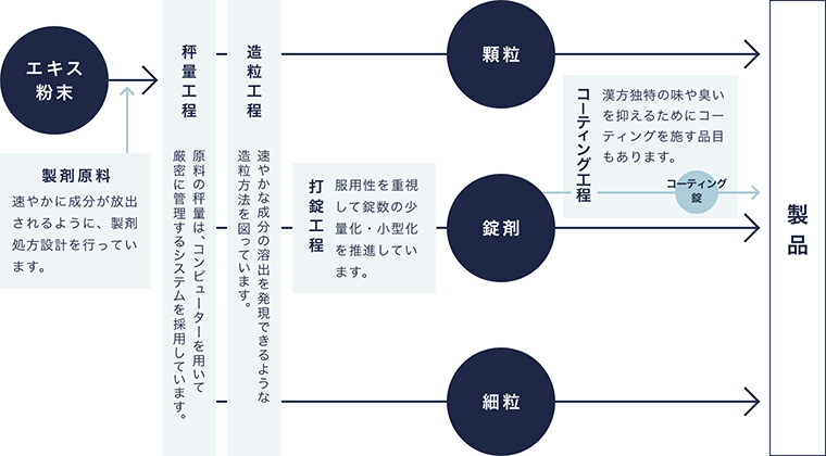クラシエの漢方には、種類に合わせて細粒、顆粒、錠剤の3種類の工程があります。