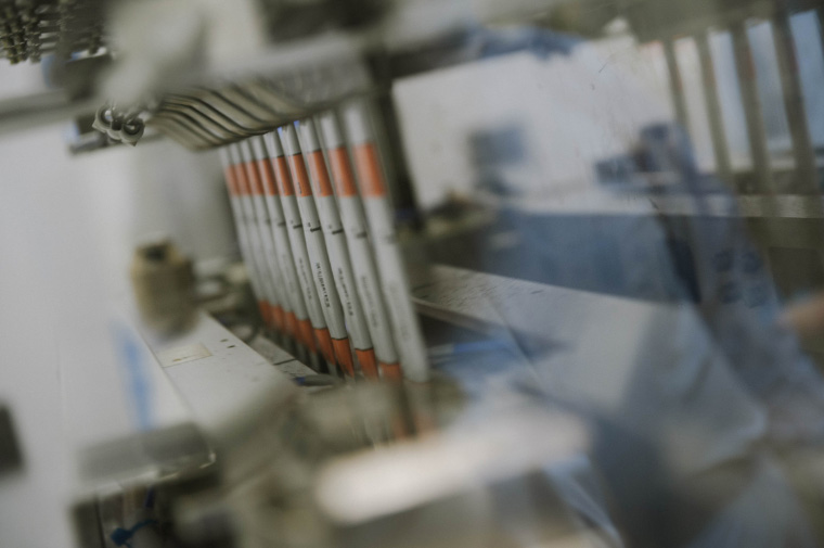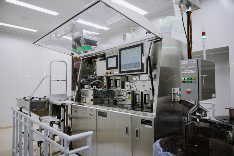 漢方製造の最後の工程である充填/包装工程。顆粒や細粒はミリグラム単位で機械によって計量され、正確な量を充填。最後にパッケージに包装して製品が完成。ほぼ全ての工程が自動で行われています。