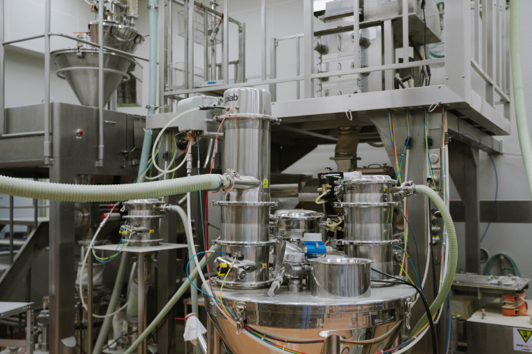 医療用の漢方薬は全て細粒と呼ばれる形状。顆粒よりも小さな粒に成形しなければならないため、秤量されたエキス粉末をローラーコンパクターという機械で板状に圧縮。これを破砕して細粒状態にし、分級機と呼ばれるサイズを振り分ける機械でふるいにかけます。