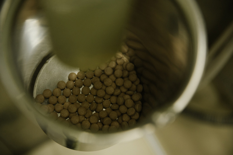 飲みやすく、体内で適切に溶けるようにするため、粉末のままではなく0.1mmから1mm程度の顆粒サイズへ粒を大きくする作業をしていきます。調合された適量のエキス粉末を均一になるよう攪拌。造粒機と呼ばれる機械で結合液とともに練り込み、粘土状になったエキス粉末をところてんのように押し出します。その後、乾燥機に入れることで一気に結合液を蒸発させ顆粒の状態に造粒します。ふるいにかけ、適切な粒サイズになったものだけを残せば完成です。