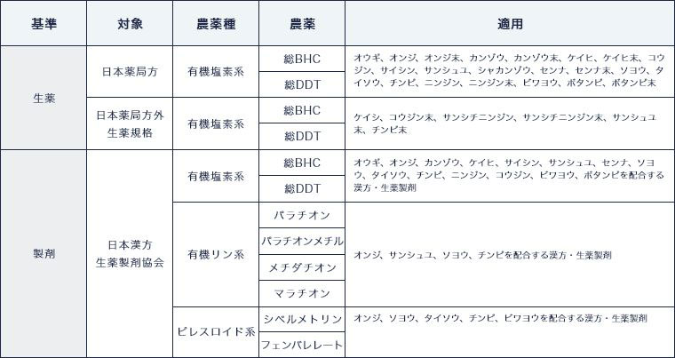 主に残留農薬が基準値以下であるかを測る試験に用いられます。日本薬局方、日本漢方生薬製剤協会の自主基準等で下記表の残留農薬基準が設定されていますが、クラシエではこれらの基準に加え、全ての生薬及び製品に対し残留農薬検査を実施し、安全性の確保に努めています。