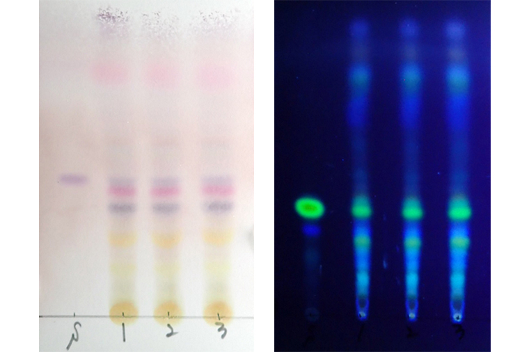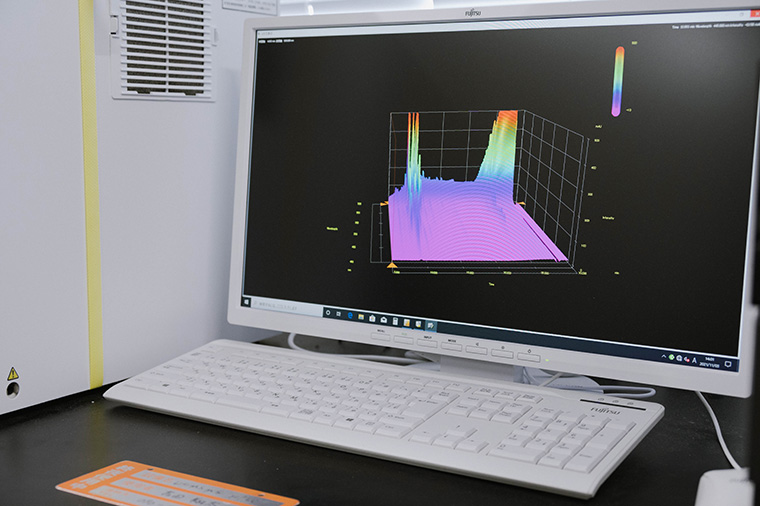 UV吸収スペクトルを利用した分析方法。製造時期の異なるエキスや製剤の成分の含有量分布を比較し、同じ分析パターンであることを確認し、品質が安定していることをチェックする試験です。