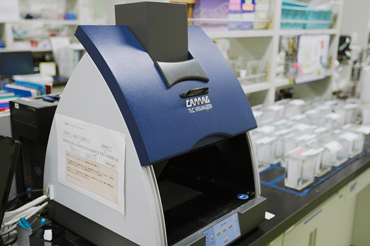 薄層クロマトグラフィーはシリカゲルなどを薄く張ったガラスの板の上で試料に反応を起こし、すばやく定性的な成分分布を確認する試験。