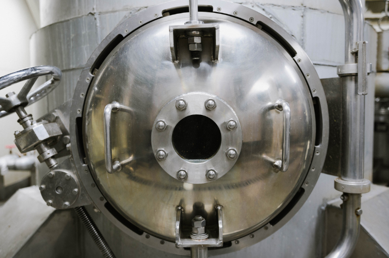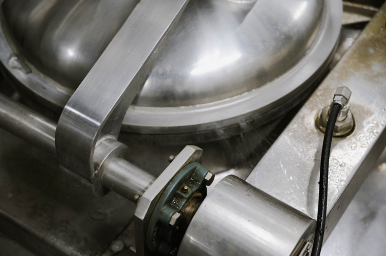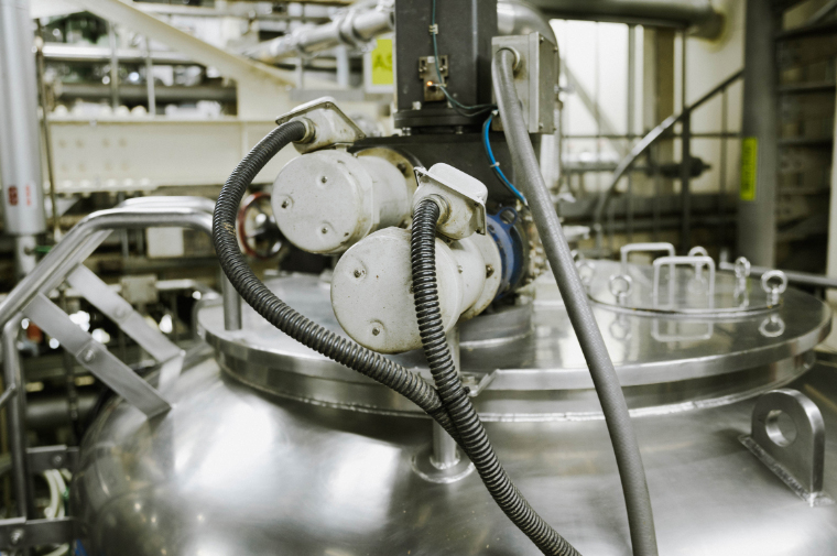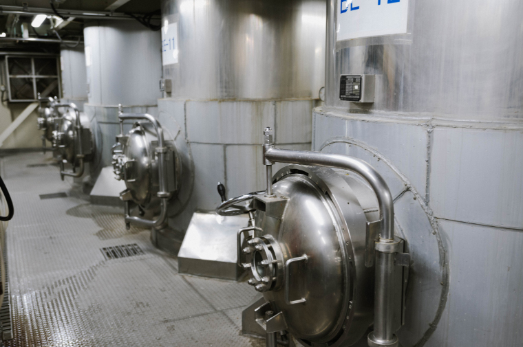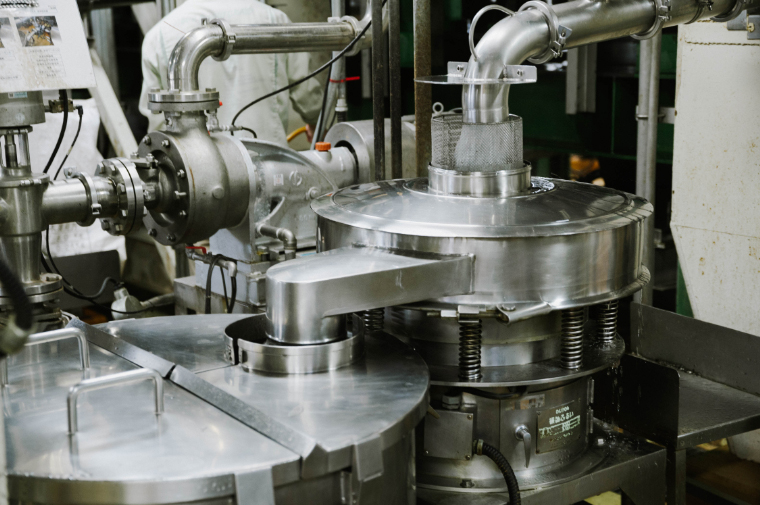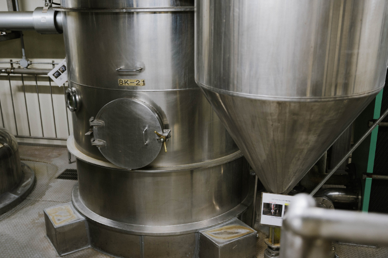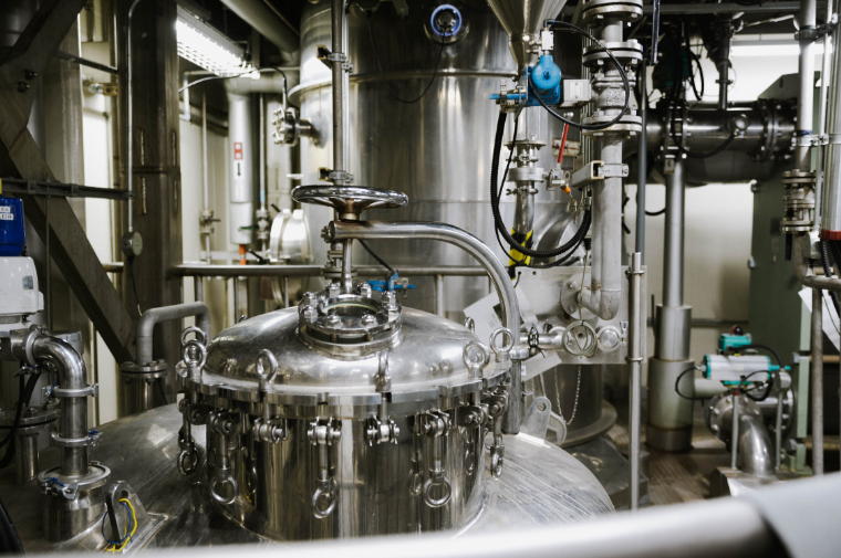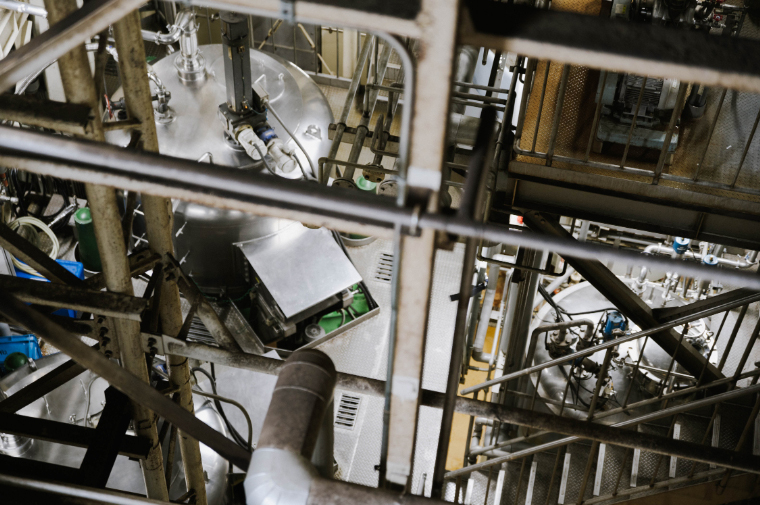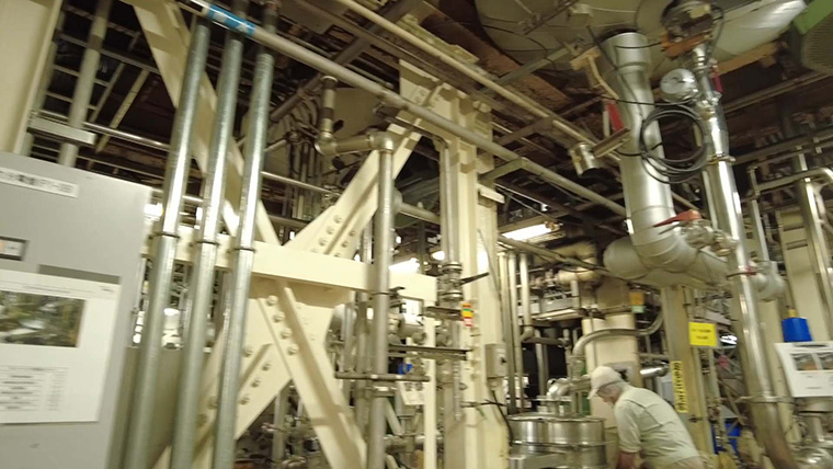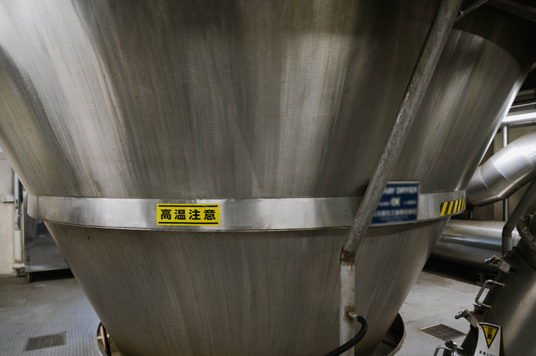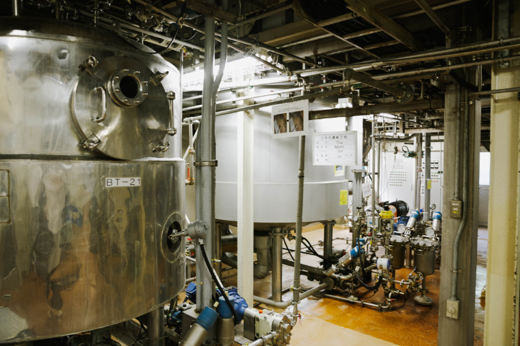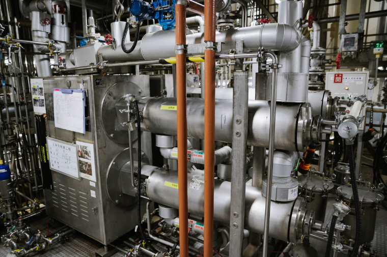 「漢方原薬製造」を行う高槻第二工場エキス粉末製造棟。生薬に熱水を加えて有効成分を抽出。濃縮、殺菌、乾燥工程を経てエキス粉末(漢方原薬)を製造します。スチームパンクなカッコいい機械と配管に囲まれたこの場所に漢方原薬製造の真髄が詰まっています。
