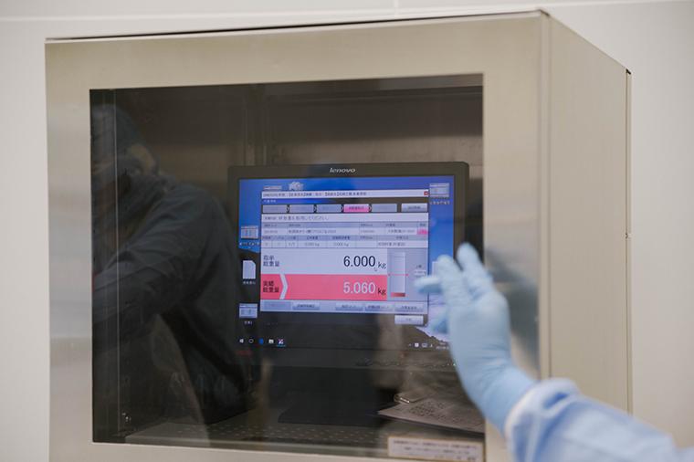 漢方薬製造では、原薬の分量は厳密に定められています。またクラシエの漢方では独自の厳しい成分基準を設けており、安定した品質を誇ります。そのために必要な作業の1つが「秤量(ひょうりょう)」。漢方薬の製造は料理と同じく下ごしらえが重要。製造の各過程で正しく原薬の分量を量ることは均一な製品を作るためのシンプルですが重要なステップ。秤量工程では、コンピューターが指定した正しい分量でない限りは次のステップに進めないように設計されており、計量時に人の目で色や形状も確認することで機械では気づきづらい細かな違和感も逃さずチェックするような運用になっています。
